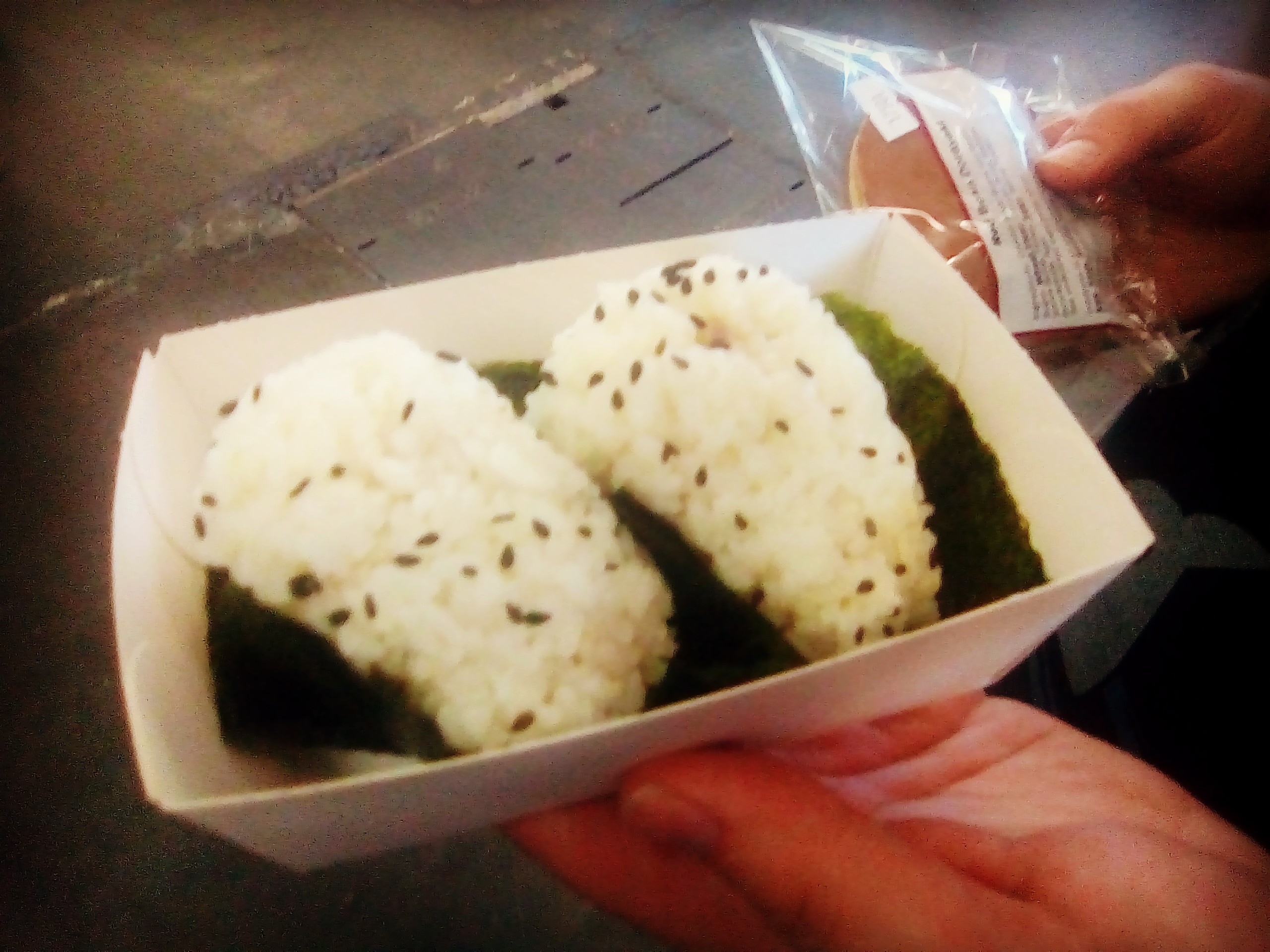 Les onigiris sont des boules de riz entourées d’une algue nori (également présente sur les makis, bien plus connus). Ils sont très connus car énormément représentés dans les mangas et dessins animés. Initialement, il s’agit d’un riz nature (éventuellement vinaigré) et c’est tout. Aujourd’hui, beaucoup sont fourrés que ça soit au thon cuit (comme ceux nous avons goûté) ou au petit pois (dans la cuisine moléculaire).